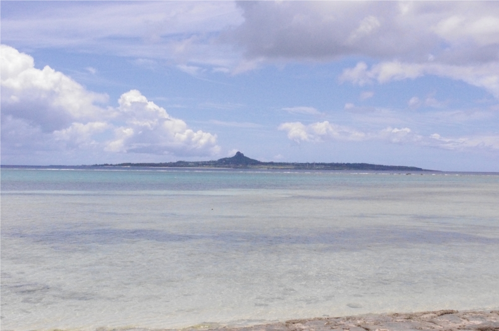 並木道を抜けたら、ビーチがあって、伊江島が丸見えでした。タッチューもモロ見え。